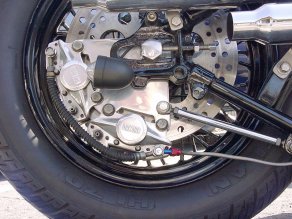 | リアにはディスクブレーキを採用。 アルミ削りだしのキャリパーサポートの迫力! |
